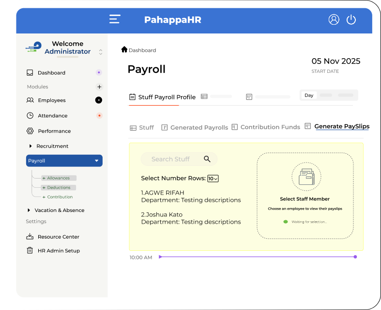 Yes, you can configure PAYE and NSSF deductions per employee. The system calculates, shows breakdowns on payslips and provides exportable reports.
