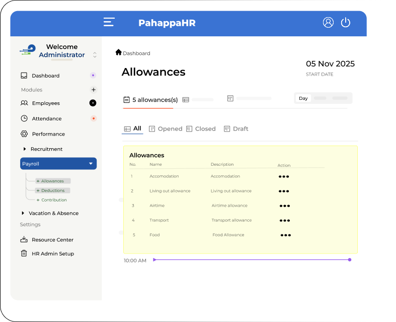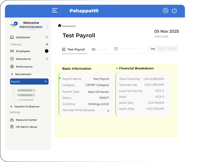PAYE, NSSF, allowances and custom deductions are computed automatically each period.